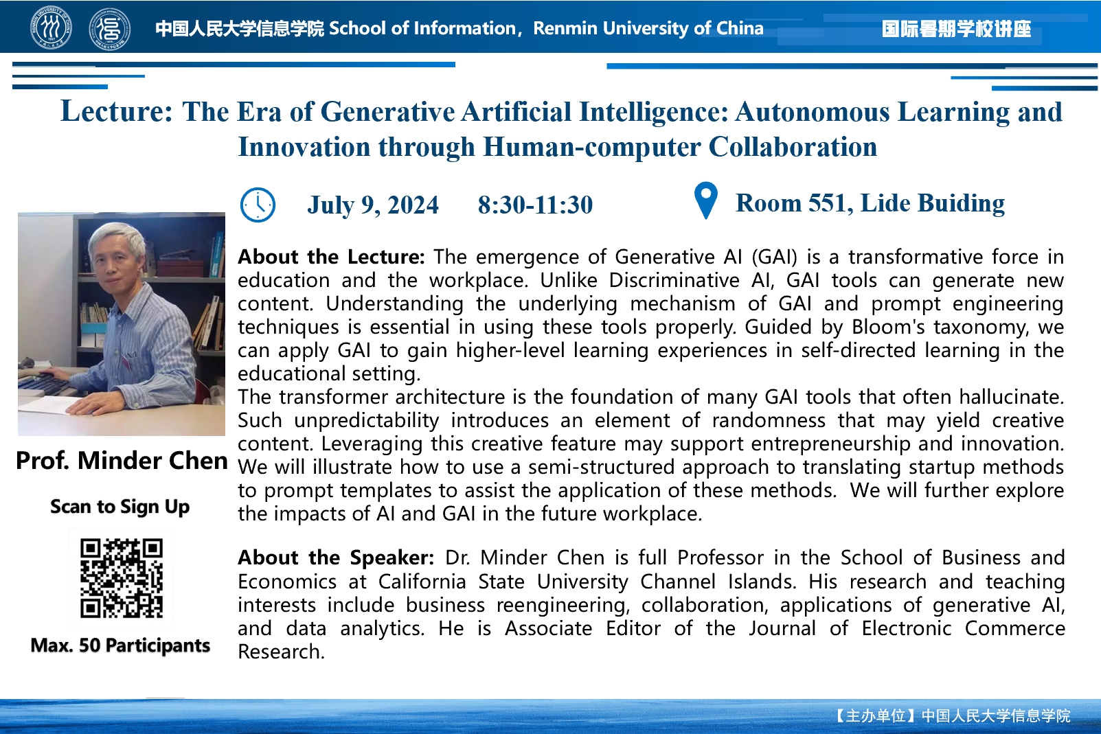 dr. minder chen is fullprofessor in the school of business and economics at california state university channel islands. his research and teaching interests include business reengineering, collaboration, applications of generative ai, and data analytics. he is associate editor of the journal of electronic commerce research.