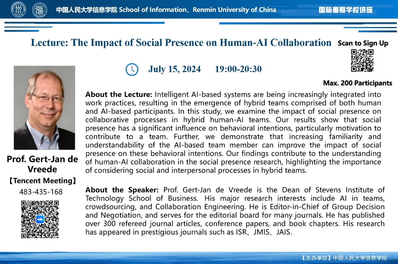 prof. gert-jan de vreede is the dean of stevens institute of technology school of business. his major research interests include ai in teams, crowdsourcing, and collaboration engineering. he is editor-in-chief of group decision and negotiation, and serves for the editorial board for many journals. he has published over 300 refereed journal articles, conference papers, and book chapters. his research has appeared in prestigious journals such as isr、jmis、jais.