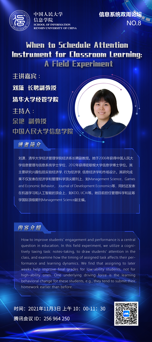 abstract: how to improve students’ engagement and performance is a central question in education. in this field experiment, we utilize a cognitively taxing task: notes-taking, to draw students' attention in the class, and examine how the timing of assigned task affects their performance and learning dynamics. we find that assigning to later weeks help improve final grades for low-ability students, not for high-ability ones. one underlying driving force is the learning behavioral change for these students, e.g., they tend to submit their homework earlier than before.