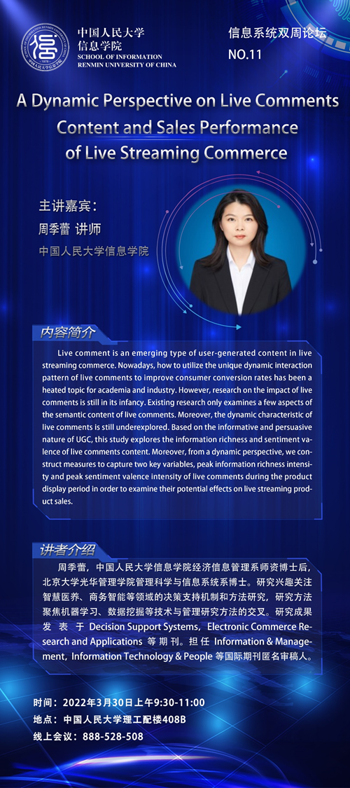 live comment is an emerging type of user-generated content in live streaming commerce. nowadays, how to utilize the unique dynamic interaction pattern of live comments to improve consumer conversion rates has been a heated topic for academia and industry. however, research on the impact of live comments is still in its infancy. existing research only examines a few aspects of the semantic content of live comments. moreover, the dynamic characteristic of live comments is still underexplored. based on the informative and persuasive nature of ugc, this study explores the information richness and sentiment valence of live comments content. moreover, from a dynamic perspective, we construct measures to capture two key variables, peak information richness intensity and peak sentiment valence intensity of live comments during the product display period in order to examine their potential effects on live streaming product sales.
