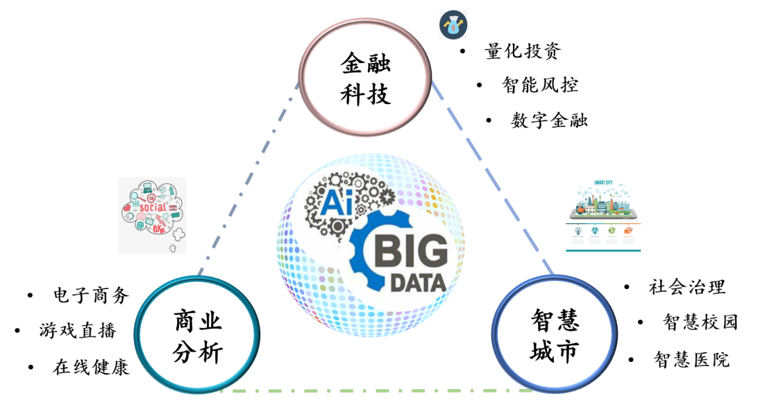 实验室面向数字化时代出现的新问题,以创新人工智能、大数据技术、区块链、元宇宙等新一代信息技术为抓手,主要应用于金融科技、商业分析、智慧城市等领域,研究框架如下图所示。