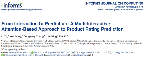 近日,我院经济信息管理系余力教授团队论文《from interaction to prediction: a multi-interactive attention-based approach to product rating prediction》在国际管理科学与运筹学顶级期刊informs journal on computing(utd期刊)上发表。第一作者为余力,论文合作者有其指导硕士生龚伟、丁雨,美国北卡大学夏洛特分校教授张东松、博士生傅哲。