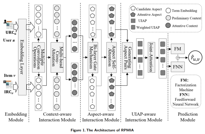 具体来说,rpmia首先采用多头交叉注意力机制来捕捉物品和用户上下文之间的交互。随后,其利用一个基于双层门控的机制来提取物品和用户的方面,并通过自注意力机制在方面级别上学习它们的交互。最后,用户和物品的方面通过联合注意力机制耦合在一起,形成有意义的用户-物品方面对(uiap)。在此基础上,作者设计了一个结合因子分解机和前馈神经网络的多任务预测器,并在真实世界的数据集对rpmia进行了实证评估。