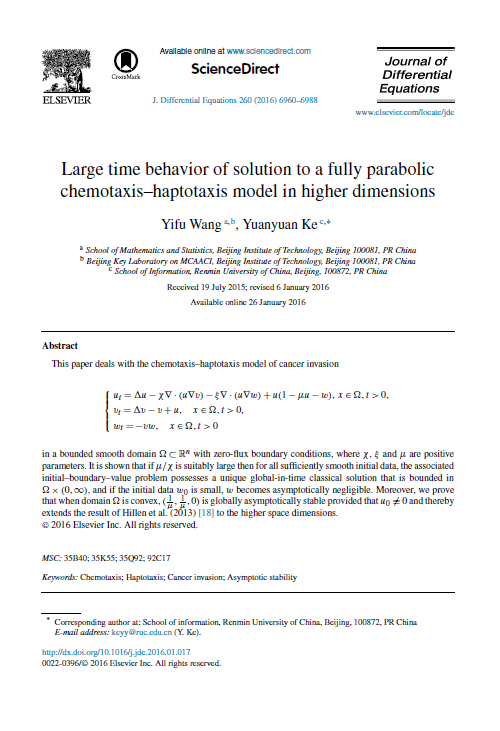 近日,数学系柯媛元老师与他人合作完成的最新研究成果“large time behavior of solution to a fully parabolic chemotaxis–haptotaxis model in higher dimensions”发表在j. differential equations杂志上. 该成果比较完整的解决了由著名生物数学家m. winkler等人于2013年提出的公开问题. 在高维空间中得到了肿瘤入侵的趋化性-趋触性模型的古典解的存在唯一性及整体有界性,并在适当条件下得到了解的渐进估计. 审稿人评价“these results are new and generalize previous knowledge, inter alia asserting similar properties in the mentioned parabolic- elliptic- ode analogue, in a natural manner. ”“beyond this, some substantially nontrivial new ideas are involved; in particular, i enjoyed seeing the generalization of a previously known argument on persistence of the total mass of cells, as expressed in lemma 4.4.”“all in all, i believe that this paper marks a relevant contribution to an active field of research, and that it will have considerable impact in the scientific community related to the analysis of problems from mathematical biology.”
