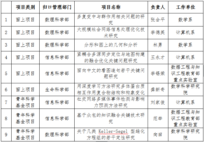 在已经公布结果的项目中,我院获得面上项目6项,青年科学基金项目3项。其中,计算机系3项,数学系2项,数据工程与知识工程重点实验室2项,数学科学研究院2项。