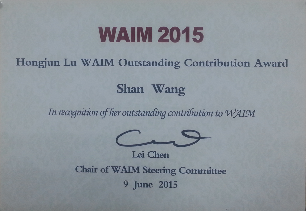 2015年6月8日至2015年6月10日,第16届网络时代信息管理国际会议(waim 2015)在青岛举行。王珊教授因担任中国计算机学会数据库专委会(ccf ctdb)主任的8年间支持创办waim并提升其影响力所作的卓有成效的努力得到指导委员会的一致赞成获得本年度大会的杰出贡献奖(outstanding contribution award)。颁奖典礼后,王珊教授应邀作了大会报告,回顾了我国数据库在国际交流、科研与教学等方面的历史和成果。