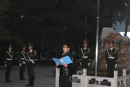 6:40,同学们在求是园有序列队集合。6:55,升旗仪式正式开始。首先,由中国人民大学武警国防生国旗护卫队的队员向同学们做《国旗法》知识宣讲,号召同学们以实际行动爱护、尊重、捍卫国旗。宣讲完毕后,国旗护卫队的国防生同学们迈着矫健的步伐入场,铿锵有力的脚步声响彻求是园。五星红旗伴着雄壮的《义勇军进行曲》缓缓上升,同学们庄严肃立,向国旗行注目礼。天气虽然寒冷,仍挡不住同学们心中激荡的爱国情怀!