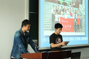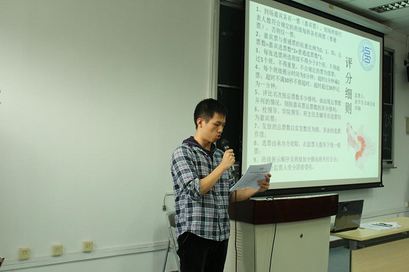 首先,信息学院党委副书记张国富老师上台致辞,从学院角度对参选年级班级的成绩给予了肯定和赞扬,对2015级的新生提出了几点要求并寄予殷切期望,希望他们能以师兄师姐为榜样,不断超越自己,让学院学风建设迈上新的高度。在监票人前学生会副主席郑翰同学宣读完评分细则后,各班代表按抽签顺序依次登台,通过ppt、视频,演讲等多种形式,各个班级分别从“思想建设”、“学习情况”、“自主活动”、“配合学院活动”、“展示表现”等诸多方面展示了丰富的课内外活动,全面表现了班级独特的精神风貌和班级建设成果。
