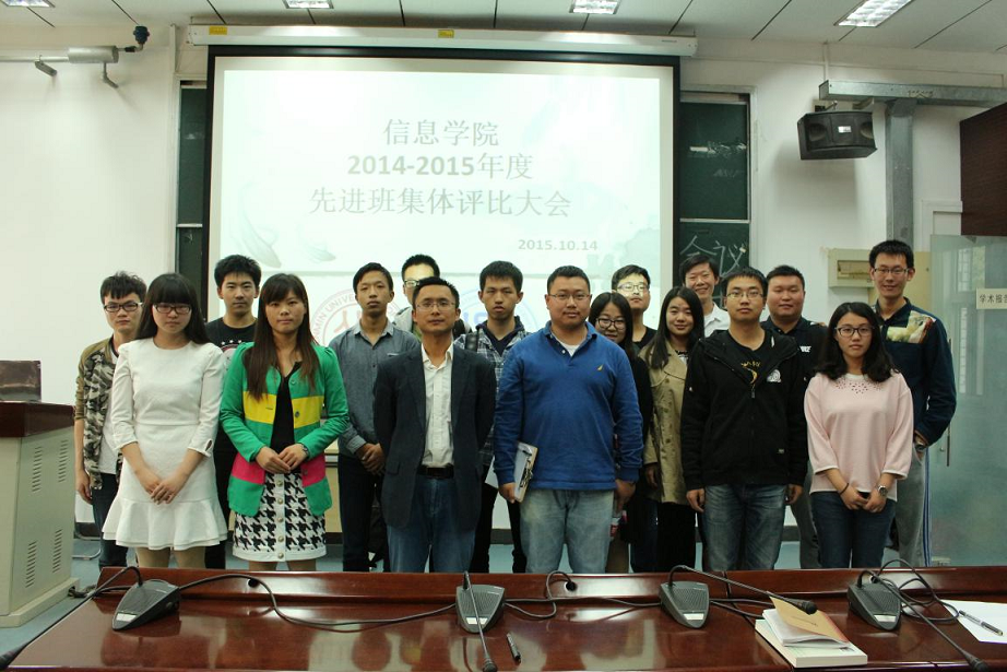 2015年10月14日下午,信息学院2014-2015年度先进班集体评选大会在信息楼四楼学术报告厅拉开帷幕。本次评选活动由信息学院分团委组织部承办,校学生处孙琳老师、信息学院党委副书记、新疆财经大学计算机科学与工程学院党远支书记迪力努尔•阿布拉老师、信息学院党委副书记张国富老师、信息学院分团委书记蔡晓雨老师、信息学院分团委常务副书记王晓彤老师、2013-2014级各班班主任、辅导员及全体本科生各班班级代表出席了本次活动。