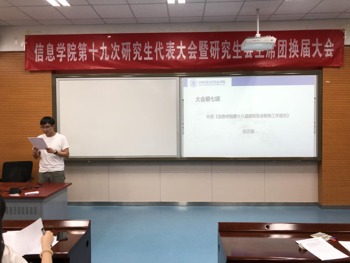 本次大会听取并审议通过了《信息学院第十八届研究生会工作报告》,第十八届研究生会主席英辰光同学从引导研究生提高政治站位、强化责任担当,丰富研究生课余生活和推动研究生成长成才等方面对学院研究生会去年的工作进行了总结,并提出了对研究生会新一年工作的期望与寄语。大会还听取了由第十八届研究生会副主席段志强同学所做的《信息学院第十八届研究生会财务工作报告》。