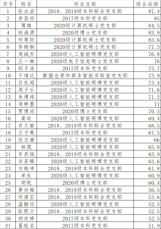 为认真贯彻发展党员工作“控制总量,优化结构,提高质量,发挥作用”的方针,进一步加强对发展党员工作的民主监督,严把发展党员“入口关”,保证新发展积极分子的质量,根据有关要求,现对已参加学院第36期党校培训且单项、综合均考核合格的31名学员进行公示,以听取党内外群众意见。