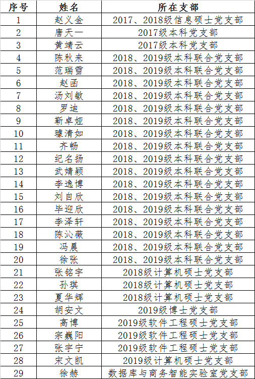 综合考虑本次各支部所推荐发展对象人选的支部推荐顺次、学院党团活动参与情况、推优考试成绩等多个方面,按照学校党委关于发展学生党员中本科和研究生推荐比例、毕业班和非毕业班推荐比例要求,经充分讨论及前期公示,信息学院党委拟向学校党校推荐29名学生参加第35期学生发展对象培训班学习。推荐学员名单如下: