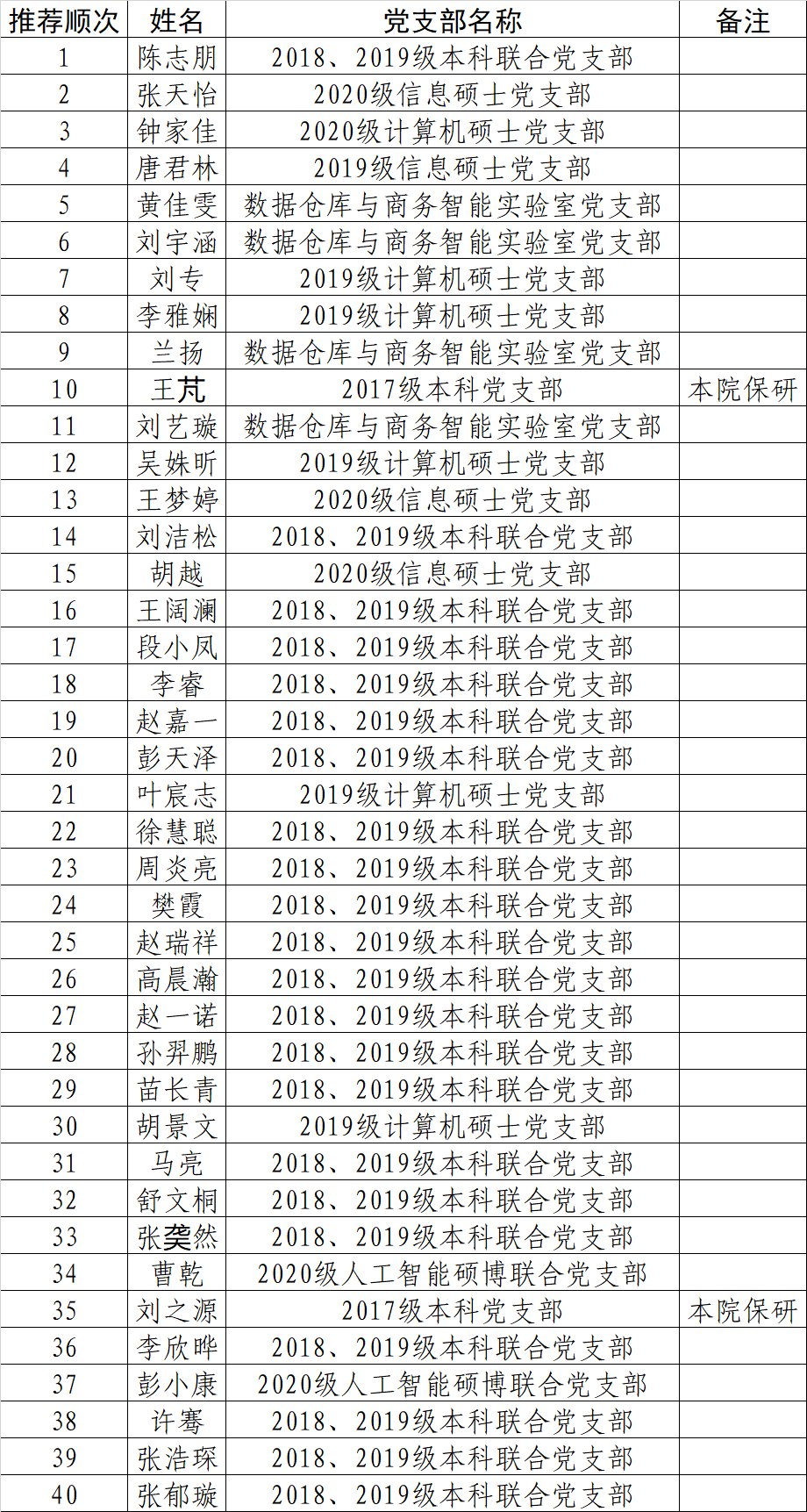 综合考虑本次各支部所推荐发展对象人选的综合素质、党群团组织推优和学院党委审查情况,按照《关于做好学校党校第37期学生发展对象暨第36期教工发展对象培训班学员推荐工作的通知》,经充分讨论及前期公示,信息学院党委拟向学校党校推荐40名学生参加第37期学生发展对象培训班学习。推荐学员名单如下: