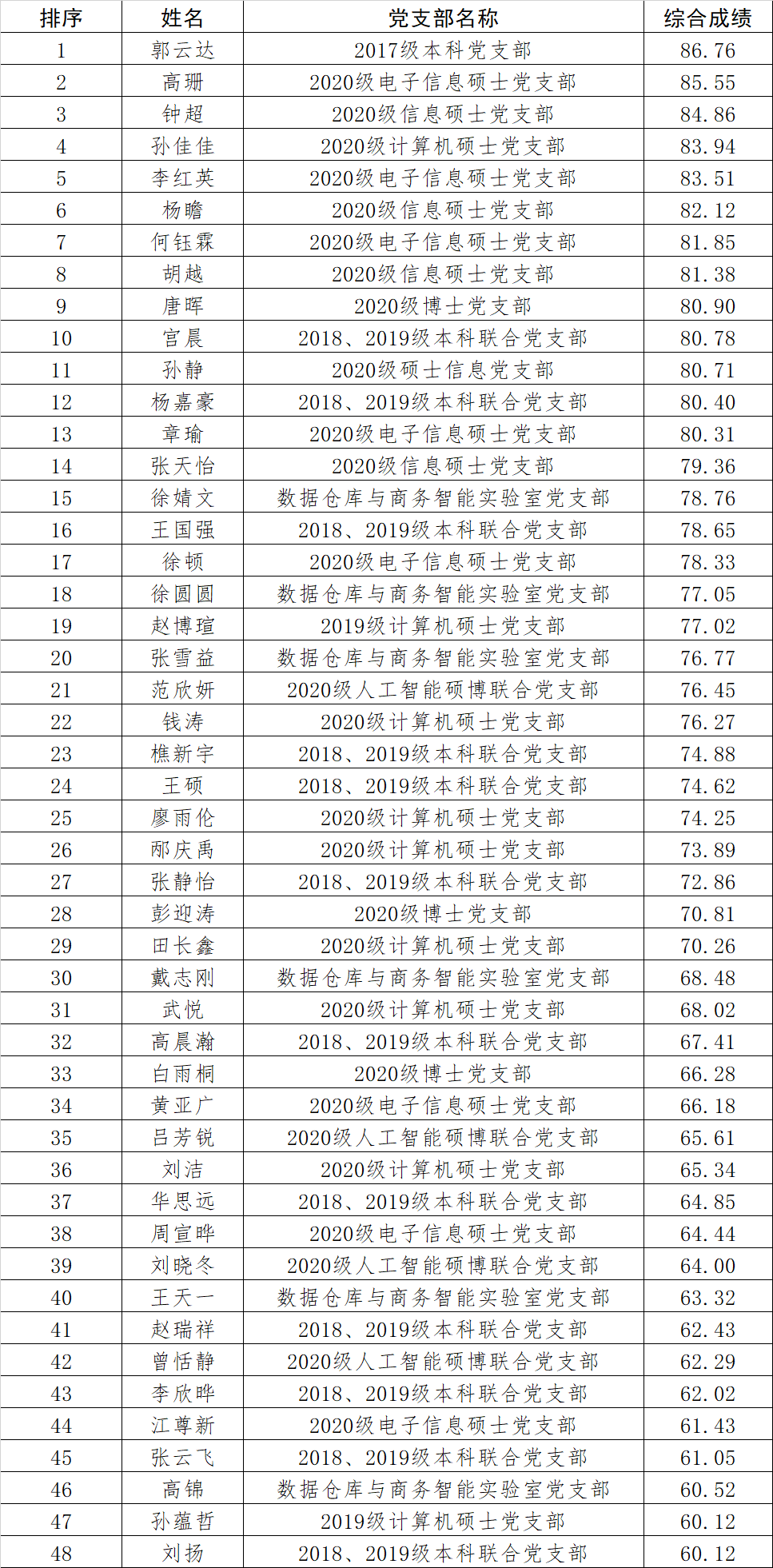 为认真贯彻发展党员工作“控制总量,优化结构,提高质量,发挥作用”的方针,进一步加强对发展党员工作的民主监督,严把发展党员“入口关”,保证新发展积极分子的质量,根据有关要求,现对已参加学院第35期党校培训且单项、综合均考核合格的48名学员进行公示,以听取党内外群众意见。