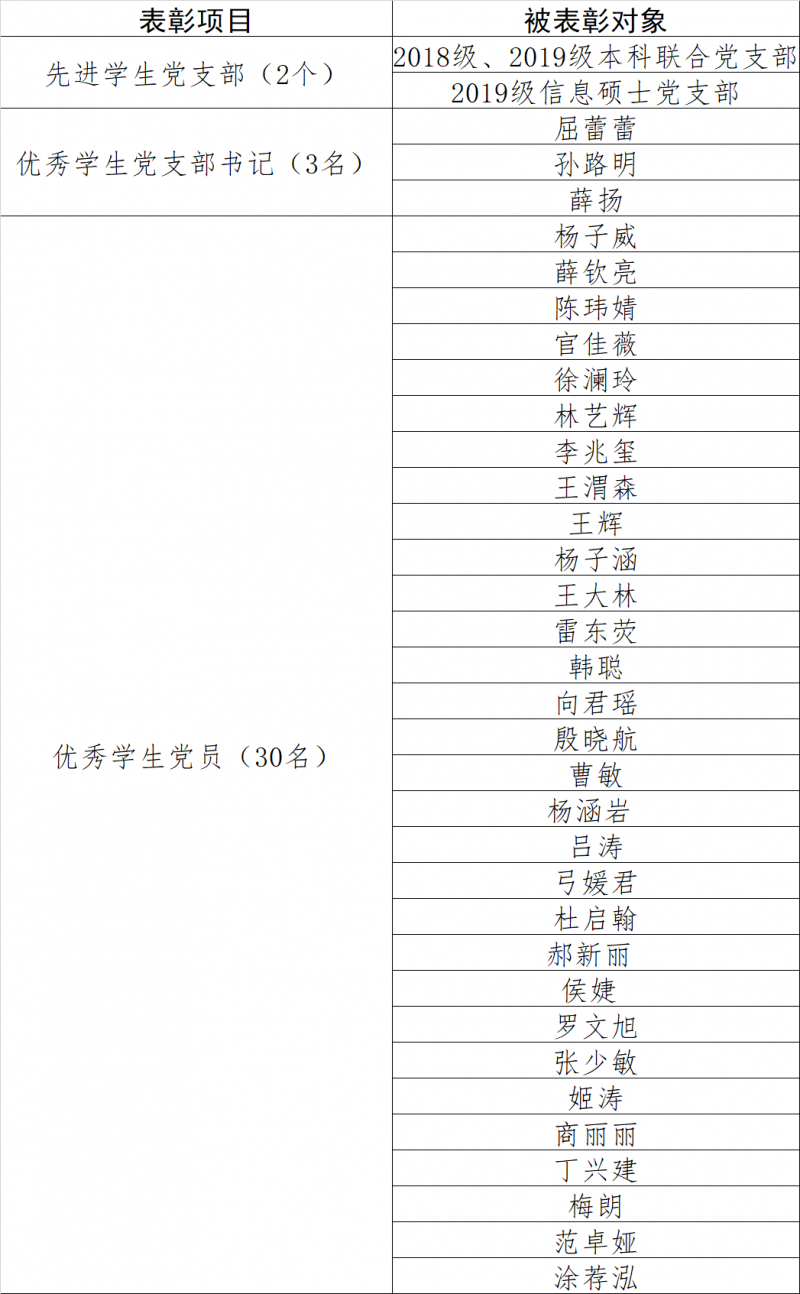 根据中共中国人民大学信息学院委员会《关于做好2020年度基层党支部书记抓党建述职评议考核工作的通知》《关于召开2020年度基层党支部组织生活会和开展民主评议党员的通知》《关于评选表彰2020年度先进学生党支部、优秀学生党支部书记、优秀学生党员的通知》要求,经各基层党支部述职、评议、推荐,学院党委审核、把关、评选,现将拟表彰的2020年度院级先进学生党支部、优秀学生党支部书记、优秀学生党员表彰名单(排名不分先后)公示如下: