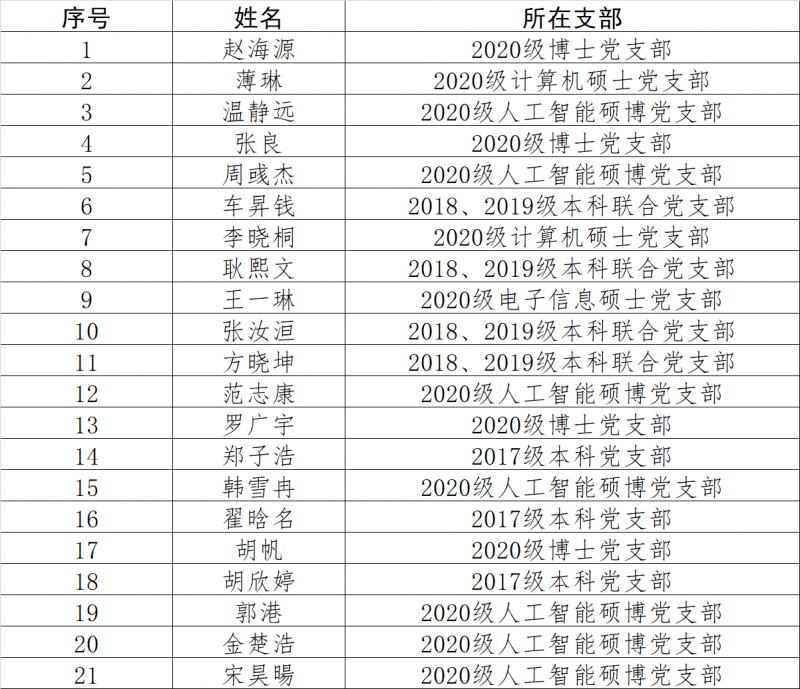 为认真贯彻发展党员工作“控制总量,优化结构,提高质量,发挥作用”的方针,进一步加强对发展党员工作的民主监督,严把发展党员“入口关”,提高学员培养质量,根据学校党委相关规定,现对已参加此次党课学习小组且单项、综合均考核合格的学员名单进行公示,以听取党内外群众意见。
