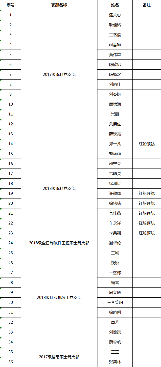 综合考虑本次各支部所推荐发展对象人选的推优考试成绩、支部推荐顺次、学院党团活动参与情况等多个方面,按照学校党委关于发展学生党员中本科和研究生推荐比例、毕业班和非毕业班推荐比例要求,经充分讨论及前期公示,信息学院党委拟向学校党校推荐36名学生参加第34期学生发展对象培训班学习。推荐学员名单如下:
