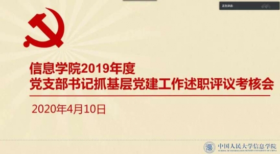 4月10日上午,信息学院2019年度党支部书记线上述职评议考核会议顺利召开。受疫情影响,会议通过“腾讯会议”以零接触方式进行。学院党委书记陈红,院长文继荣,理工学科建设处处长杜小勇,副院长李翠平、张孝,大型科学仪器共享平台副主任陈跃国,党委副书记杜忠朝,高瓴人工智能学院副院长张国富,其他党委委员、学系主任、全体师生党支部书记和党员代表参加会议。会议由陈红主持。