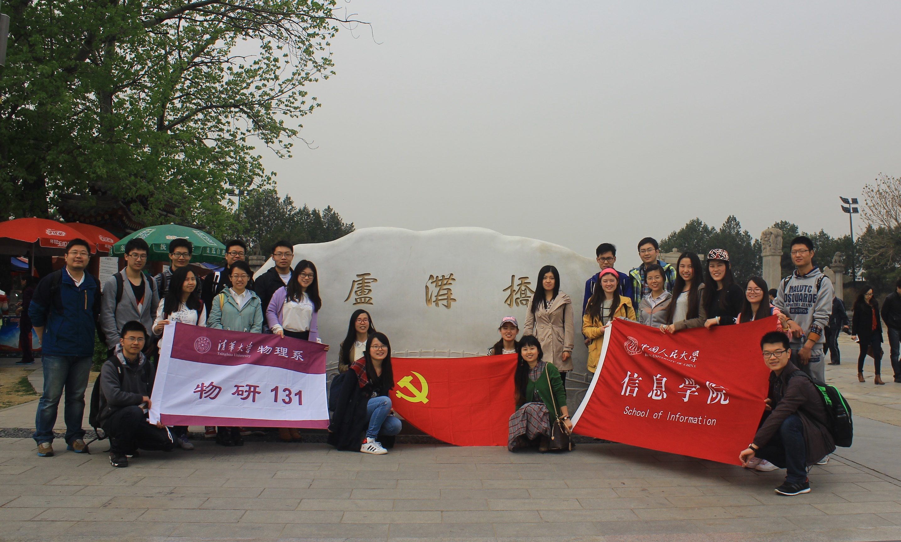 2015年4月18日,信息学院2014级信息系硕士党支部来到了卢沟桥,在享受盎然春意的同时也追忆革命先烈。2014级信息系硕士班的全体党员、预备党员、积极分子以及党校学习成员参加了本次活动。同时,作为我校和清华大学两校联谊活动,清华大学物理系党支部的12位党员也参加了本次活动,两校党员间的互动交流也加深了此次活动的意义。