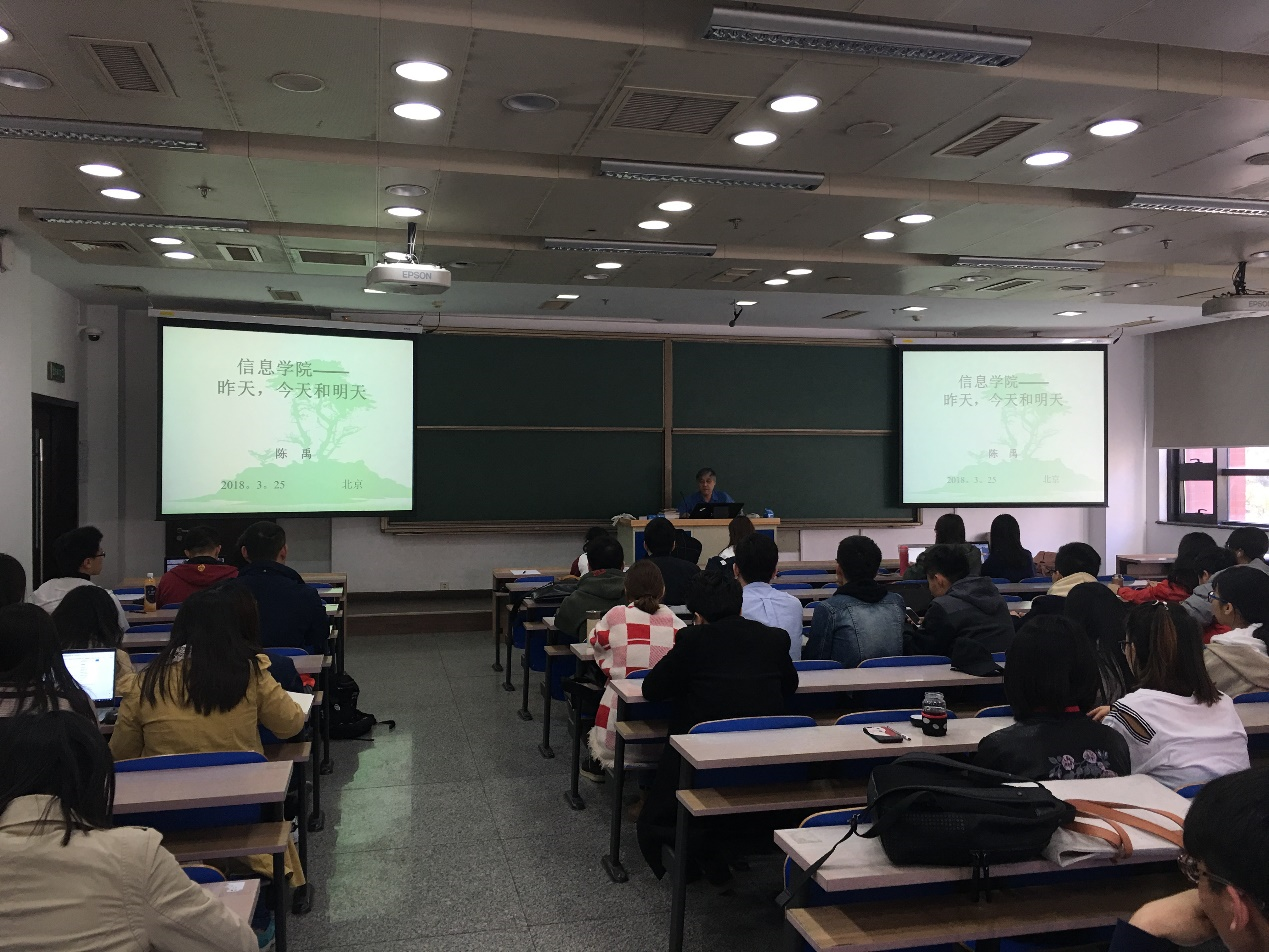 2018年3月25日,信息学院第三十期入党积极分子培训班第一课在明德法学楼0101开讲,我院前院长陈禹教授为学员们带来了主题为“信息学院——昨天、今天和明天”的党课。我院三十期入党积极分子培训班学员、2016、2017级数学系硕士党支部、2016、2017级信息硕士党支部、各年级博士生党支部全体成员,以及理学院党校学员参加了此次党课学习。