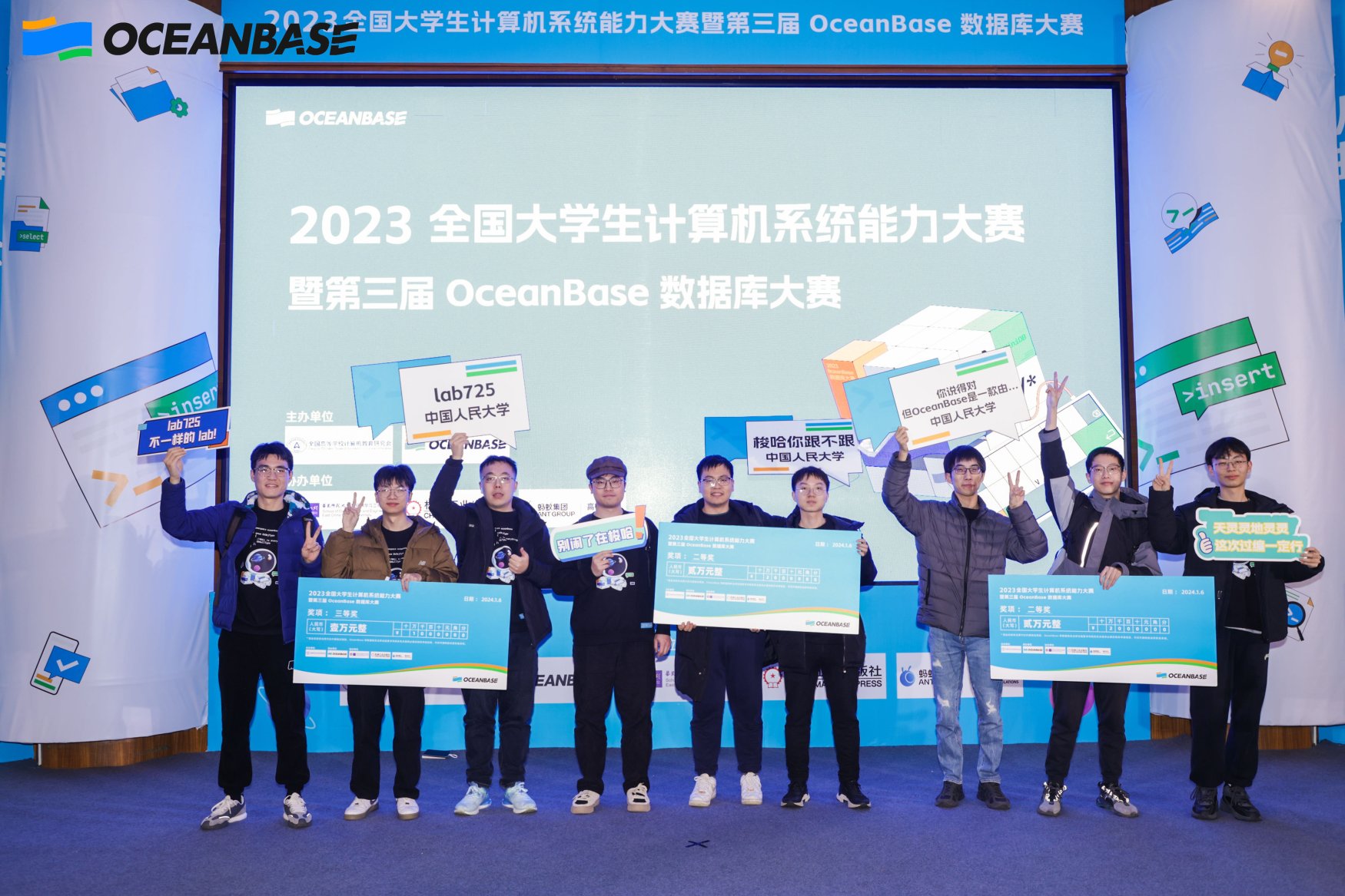 2024年1月6日,2023全国大学生计算机系统能力大赛暨第三届oceanbase数据库大赛(以下简称大赛)在上海落下帷幕。中国人民大学信息学院云计算与大数据系统实验室的三支参赛队伍在我院柴云鹏教授的指导下,经过为期三个月的激烈角逐,均在复赛中跻身全国前10名并在决赛中取得了两项二等奖与一项三等奖的佳绩,展现了我院学子的风采。