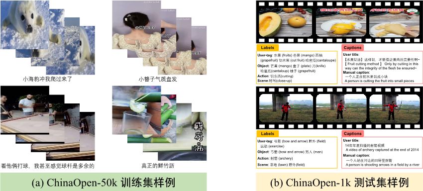 随着大语言模型和多模态大模型的出现和应用,学术界和工业界在视频自动标记 (video tagging)、视频描述生成 (video captioning)、跨模态视频检索 (text-to-video retrieval)等多个具有挑战性的视频内容理解和检索任务上均取得了明显进展,在任务特定的英文评测集上表现出了较好的性能。国内多家机构也陆续推出了中文多模态模型,比如用于跨模态图文匹配的cn-clip, taiyi, ernie-vil2和用于视觉描述生成的ofa-chinese等。尽管如此,这些模型在真实开放场景下的有效性仍有待验证。针对上述问题,本文基于b站数据构建了一个名为chinaopen的中文短视频研究数据集,用于开放场景多模态学习和多任务评测。该数据集由两部分组成,分别是弱标注训练集chinaopen-50k和人工标注测试集chinaopen-1k。chinaopen-50k的构建流程采用了包括文本分析、人脸识别、视频内容识别、视频标签相关性学习等多项关键技术,对原始b站数据进行自动清洗,从而提升训练数据质量。chinaopen-1k的每个视频带有不同维度的人工标注数据,包括i) 经人工核验的用户标题和标签、ii) 关于视频内容的一句话描述、iii) 视频中主要物体 (object) /动作(action)/场景 (scene)对应的标签等。上述多维度标注使得chinaopen-1k相比现有以英文为主的数据集有明显的独特性,即可用于评测特定模型关于客观或主观描述视频内容的能力,也可用于评测模型在视频内容自动标记以及辅助用户标记的能力。此外,chinaopen-1k的中文标注已人工翻译成英文,因此也适用于评测英文多模态模型。