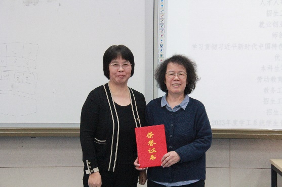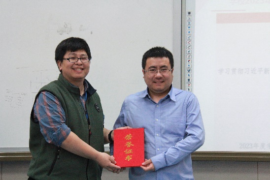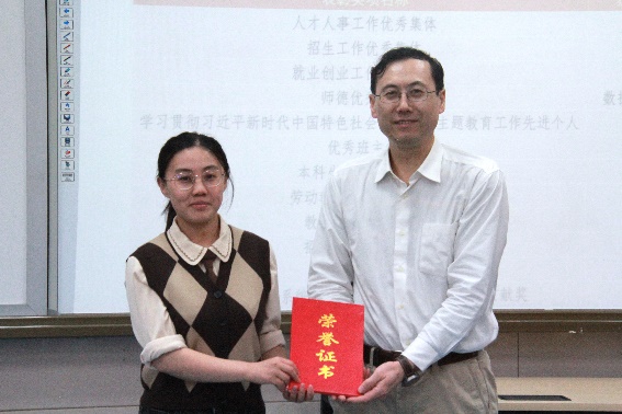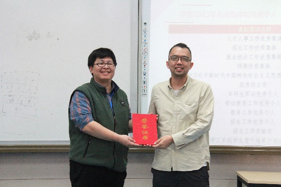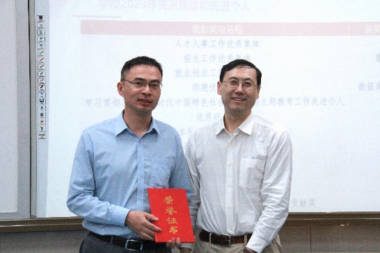 会议还通报表扬了2023年度获评学校和学院先进的个人与集体,学院领导班子成员向获奖对象颁发pa捕鱼app的荣誉证书。