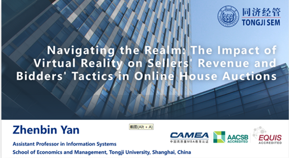 最后,由来自同济大学经济与管理学院的闫振斌助理研究员分享,报告题目为《navigating the realm: the impact of virtual reality on sellers' revenue and bidders' tactics in online house》。在报告中,他分享了在在线拍卖房产平台中虚拟现实技术的应用如何影响房产的成交价格和竞标者的“跳跃出价”和“晚期出价”策略。该研究基于真实的房产交易数据,运用工具变量等计量经济学方法,深入探讨了虚拟现实技术产生的影响。该报告不仅为理解vr技术在房产销售中的作用提供了深刻的洞见,也为在线拍卖房产平台的竞标者提供了新的策略思考。
