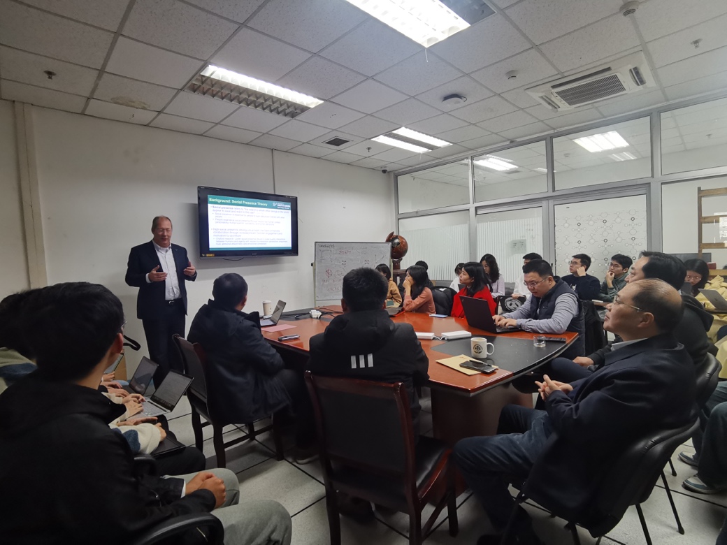 2023年12月18日星期一上午,信息学院经济信息管理系组织了“信息系统”双周讲坛第32讲——社会临场感在人机智能协作过程中的影响研究。美国南佛罗里达大学商学院gert jan de vreede教授应邀在中国人民大学理工配楼408会议室开展了一场精彩的学术报告。本次讲座由信息学院程絮森教授主持,信息系左美云教授、余力教授、杨波副教授、余艳副教授、李倩副教授、黄科满副教授等多名师生参加了讲座交流,讨论气氛热烈。