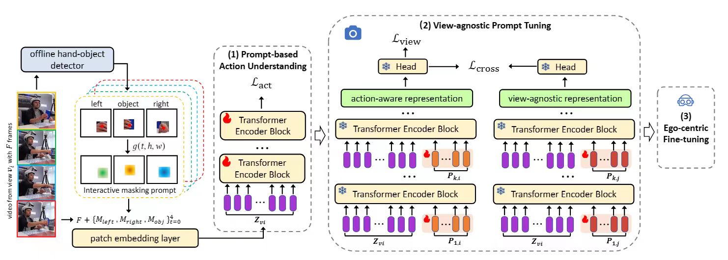 人类擅长从第三视角中观察人物交互过程(hoi)进行学习并把知识迁移到第一视角上,然而当前的方法很难实现从第三视角到第一视角的知识迁移。尽管一些方法尝试利用大规模第三视角视频预训练来学习与第一视角相关的表征,但它们忽略了第三视角视频中隐含的视角相关知识,而挖掘多视角的知识来学习视角无关表示能够缓解视角适应的困难。以此为出发点,本文提出了一个名为pov的基于视觉提示的训练框架,能够利用视觉提示从第三视角视频中学习hoi知识以及视角无关的表征,在下游的第一视角视频微调时利用少量样本就可以更好的进行知识迁移。具体而言,它在视频帧上引入交互掩码提示,以捕捉细粒度的hoi动作信息;同时在token级别输入引入视角感知提示,通过挖掘多视角的知识来学习视角无关的表征。我们在assembly101和h2o两个数据集上构建了基准,用于评估从第三视角预训练到第一视角微调的迁移和泛化能力,广泛的实验结果表明pov框架在视角适应和泛化方面的有效性。