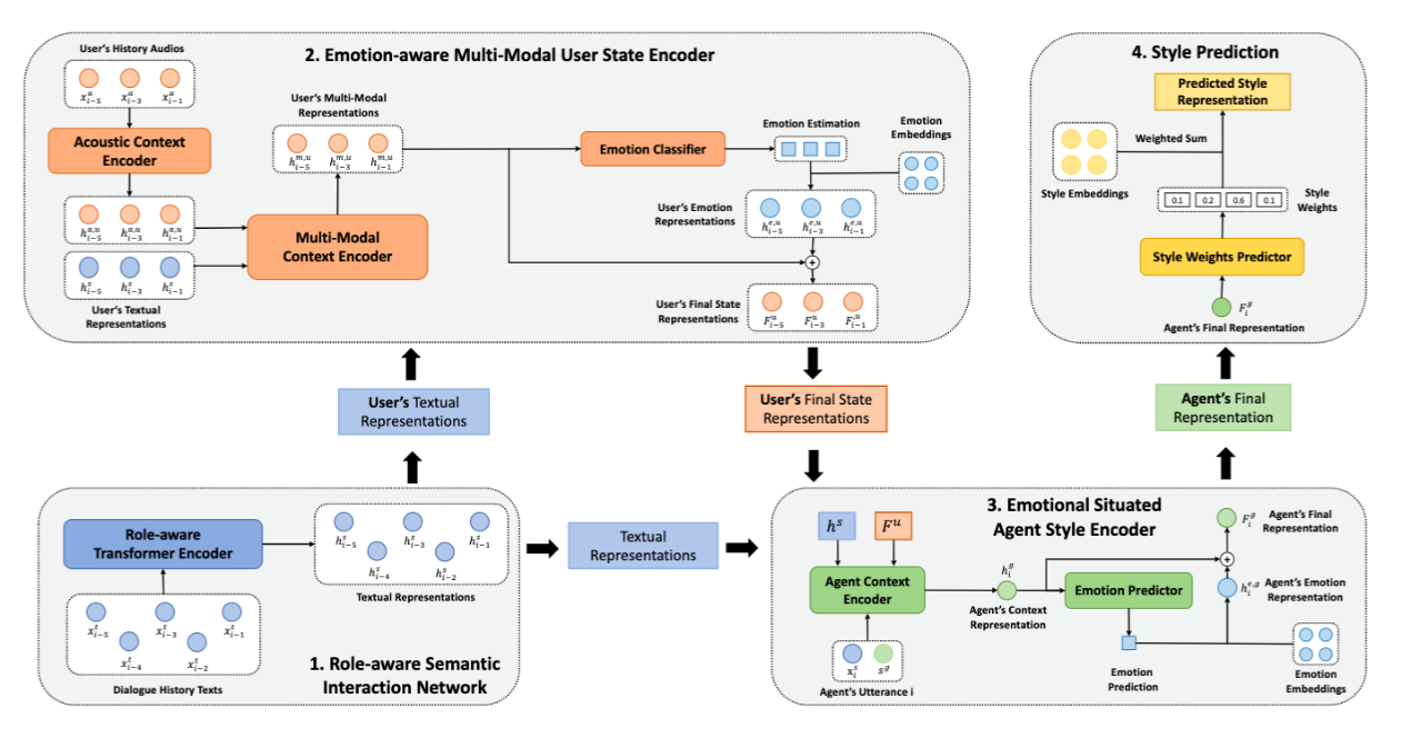 如上图所示,在建模对话历史信息时,emosit-tts首先分别建模用户和助理所说出的文本信息,随后针对性地建模用户的多模态信息交互,并预测用户的情感,以便更好地理解用户;随后,基于对对话历史和用户状态的理解,emosit-tts通过注意力模块将其总结为当前句子中助理的状态,并预测助理应有的情感;最后,模型将助理的情感融入风格表征中,从而合成出风格与情感适合当前场景的语音。
