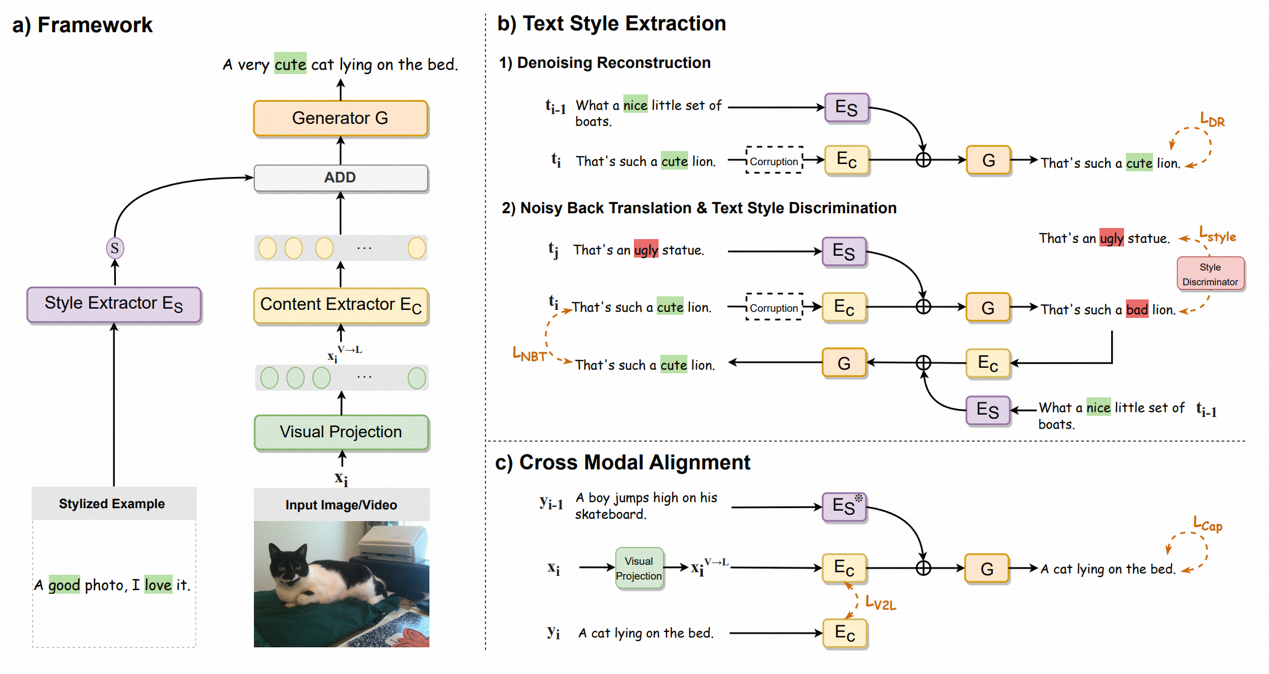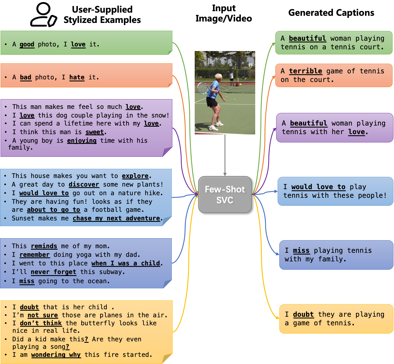 风格化视觉描述(stylized visual captioning)旨在为图像或视频生成具有特定风格、更具吸引力的描述语句。该任务的一个主要挑战是缺乏成对的数据,因此大多数工作都关注于无监督方法。然而,这些方法需要在足够的风格化语料上进行训练,并且生成的描述会限定在预设的风格类型中。为克服这些限制,本文探索了少样本指导的风格化视觉描述任务。如图1所示,该任务支持用户输入具有任意风格的少量例句,系统将快速地对例句的风格进行提取,并对图片/视频生成具有相似风格的描述。