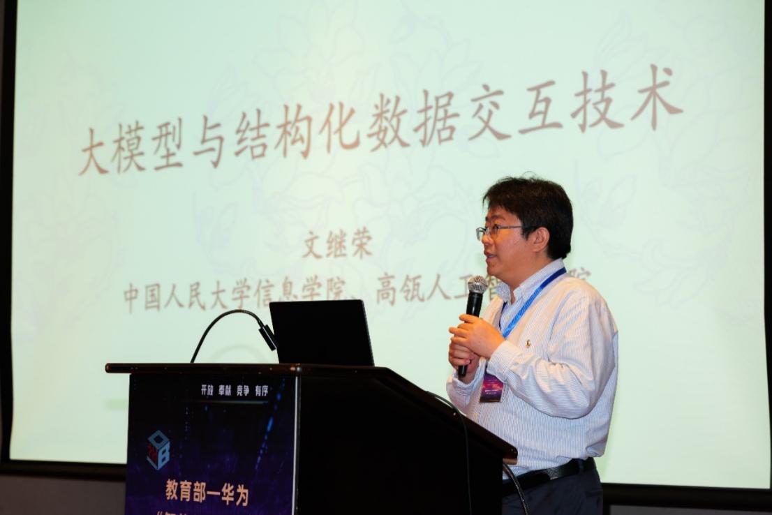 中国人民大学信息学院院长、高瓴人工智能学院执行院长文继荣教授以“大模型与结构化数据交互技术”为题作了大会报告。文老师指出,虽然大模型在处理通用任务方面表现出色,但在特定领域的知识方面通常存在缺陷;而结构化数据中则蕴含了丰富的领域知识,但其访问结构往往受到限制。他进一步认为,如果大语言模型能够有效地访问并利用这些结构化数据,将极大地增强其解决特定领域问题的能力。文老师还介绍了自己课题组最近在大模型与结构化数据交互技术方面的两项研究成果:structgpt和kg-agent。报告的最后部分,针对大语言模型对于教育的影响这一问题,他进行了经验和感想的分享。