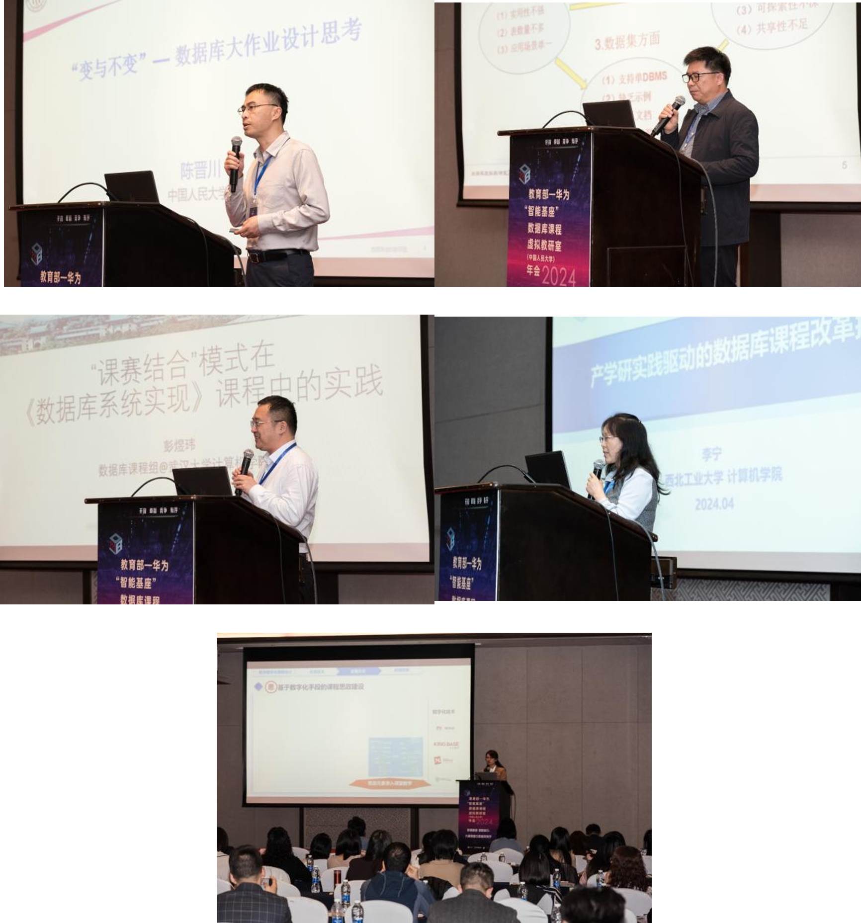 大会的专题报告环节,来自中国人民大学的陈晋川副教授、大连海事大学的张俊教授、武汉大学的彭煜玮副教授、西北工业大学的李宁副教授以及北京信息科技大学的车蕾副教授,分别就数据库课程的各个关键方面进行了精彩分享,涵盖数据库大作业设计思考、课赛结合课程实践、实验实训数据集建设、产学研课程改革探索和课程教学数字化建设等方面。这些报告为数据库教学和实践提供了多角度的见解和经验分享。