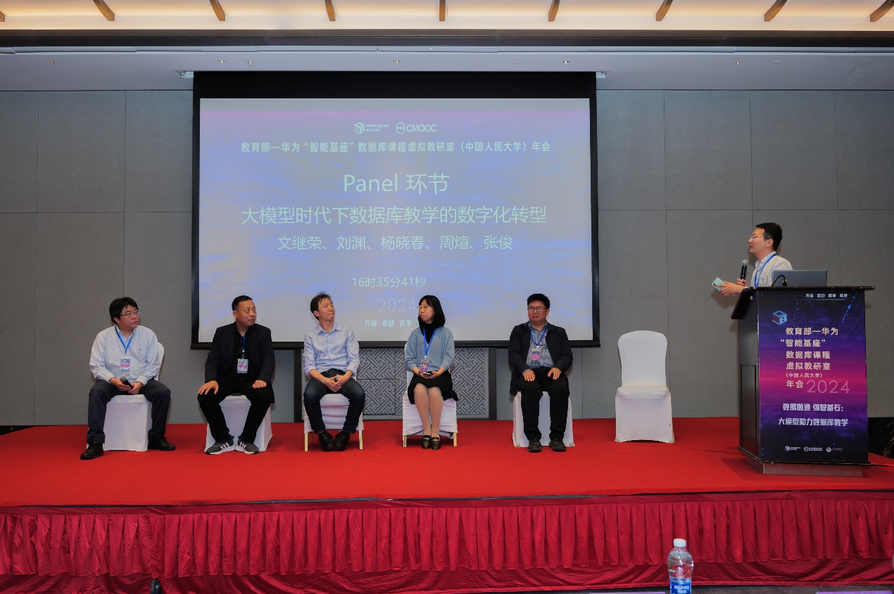 在大会的panel环节,中国人民大学的文继荣教授、江南大学的刘渊教授、华东师范大学的王晓玲教授和周烜教授、东北大学的杨晓春教授、大连海事大学张俊教授等六位专家学者,针对大模型时代下数据库教学的数字化转型等热点问题进行了深入的讨论和交流。他们共同探讨了如何利用大数据和大模型技术来优化数据库教学,以及这一转型对未来教育模式和教学内容的潜在影响。此环节为参会者提供了宝贵的见解和创新思路。
