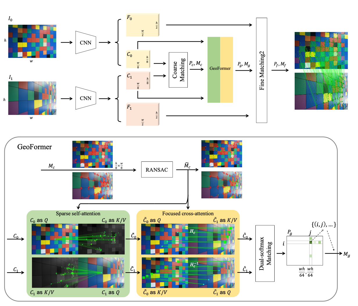 本文探讨了计算机视觉的一个基础任务:单应性估计 (homography estimation)。该任务旨在求解同一场景不同视角成像平面之间的单应变换关系,在图像配准、图像拼接、相机位姿估计、视觉slam等多种应用中起着关键作用。传统的基于关键点检测与匹配的方法计算效率高,但关键点在低纹理区域难以被有效检测,极大限制了方法适用范围。当前以loftr为代表的无检测器检测(detector-free)方法直接将整图所有像素点作为特征点进行密集匹配,从而回避关键点检测问题,扩大了方法适用范围。为了降低无关区域对于特征匹配的干扰,loftr等方法需要借助transformer自注意力网络对整图像素点进行特征交互与聚合。而为了计算可行,上述方法只能使用性能受限的线性transformer,存在注意力扩散区域欠准确、易被无关区域干扰等问题。为了解决这个问题,本文提出geometrized transformer (geoformer)。geoformer巧妙地使用经典的ransac几何方法大幅缩小参与注意力计算的图像区域,使得我们可以使用标准的二次transformer实现稀疏自注意力机制 (sparse self-attention)和聚焦跨注意力机制(focused cross-attention)。在自然图像、过度编辑图像、眼底彩照等多个真实世界数据集上开展的大量实验验证了geoformer的有效性。